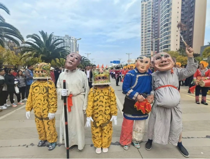 变化不止于此。2024年,在李明珍的推动下,山猫猫舞成功入选第六批市级非物质文化遗产名录。舞蹈队先后登上“昆明郑和文化旅游节”、“和谐大舞台”等,面具开合间的神秘舞姿惊艳全场,短视频在当地平台获赞超10万次。